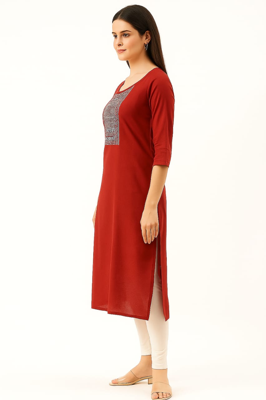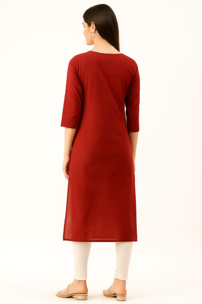 Women’s Maroon Cotton Straight Kurti with Embroidered Yoke | Elegant Ethnic Wear for Casual & Office